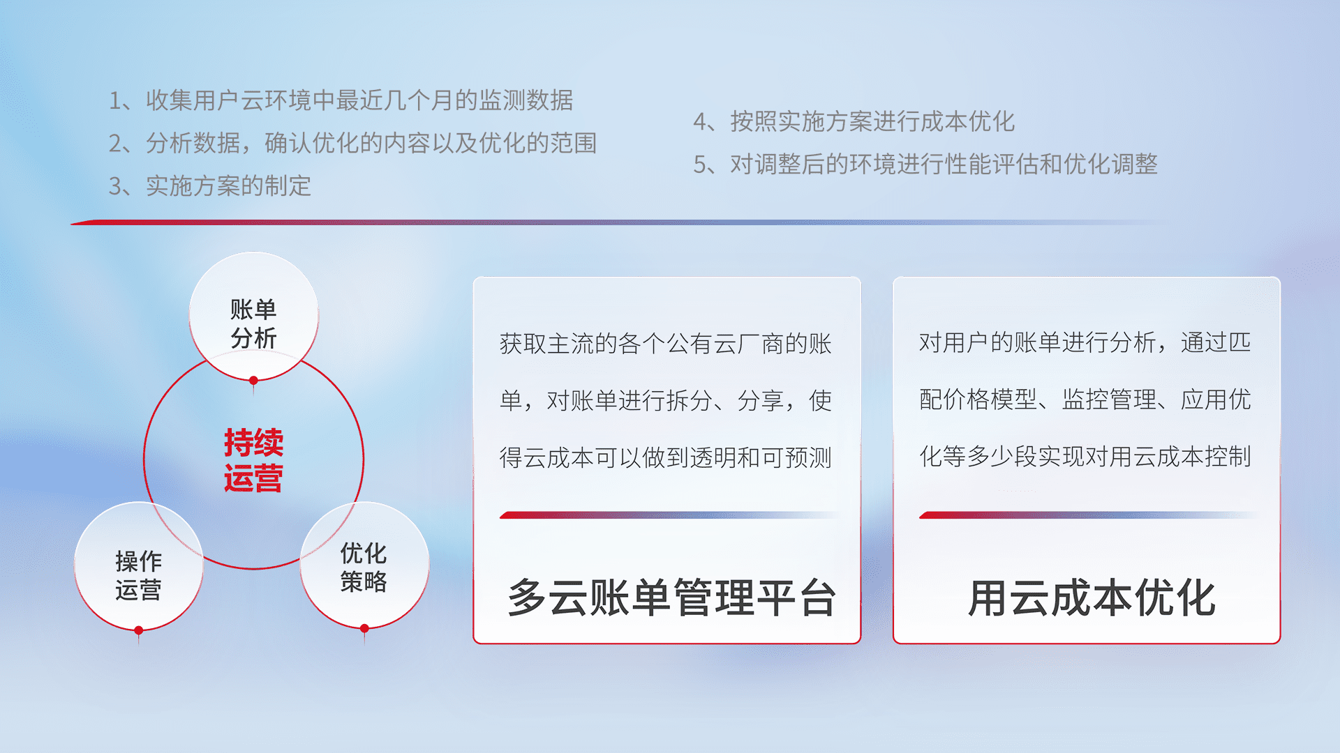 通过多云纳管,,以统一的资源数据模型把客户的云资源进行抽象和封装,,进而实现对多云资源的统一操作,,,,保障云资源管理的可靠性、、、稳定性与可用性。。量身定制化运维内容,,,配置、、、开发运维、、、、补丁管理、、、、备份、、、、监控、、认证和访问管理、、审计和日常巡检等,,,保障在用云过程中的可靠度,,,,稳定度以及高可用率。。。。