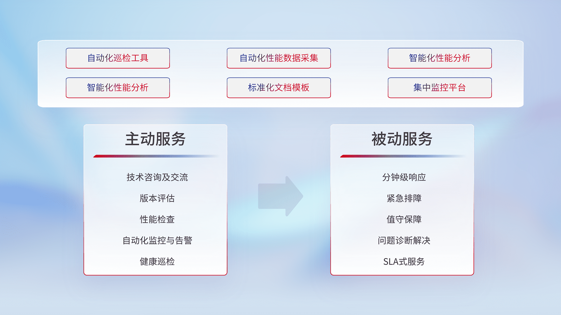 智能化工具和标准化文档,,保障服务质量,,,,提供主动服务(包含技术咨询、、、版本评估、、性能检查、、、自动化监控与告警、、、、健康巡检)和被动服务包含(分钟级响应、、、、紧急排障、、值守保障、、、、问题诊断解决、、SLA服务)。。。